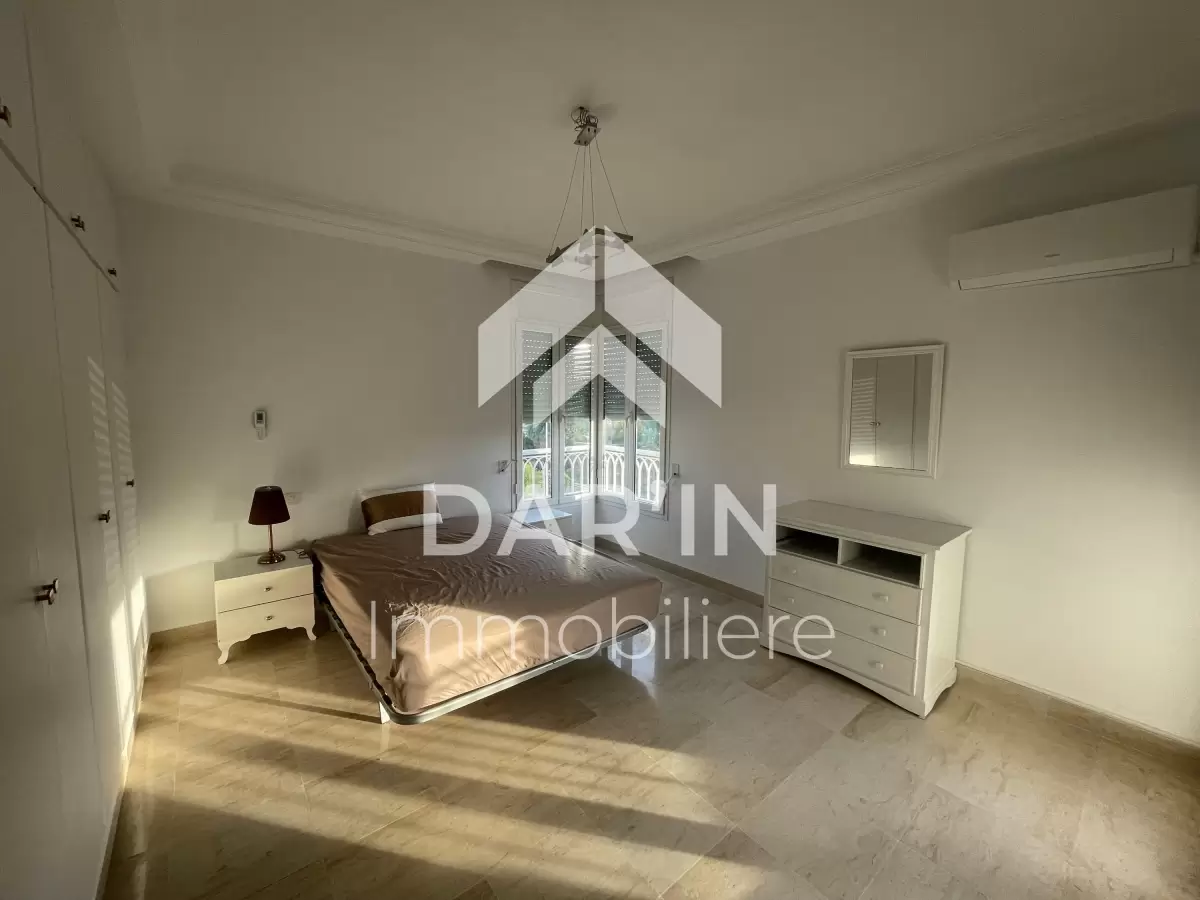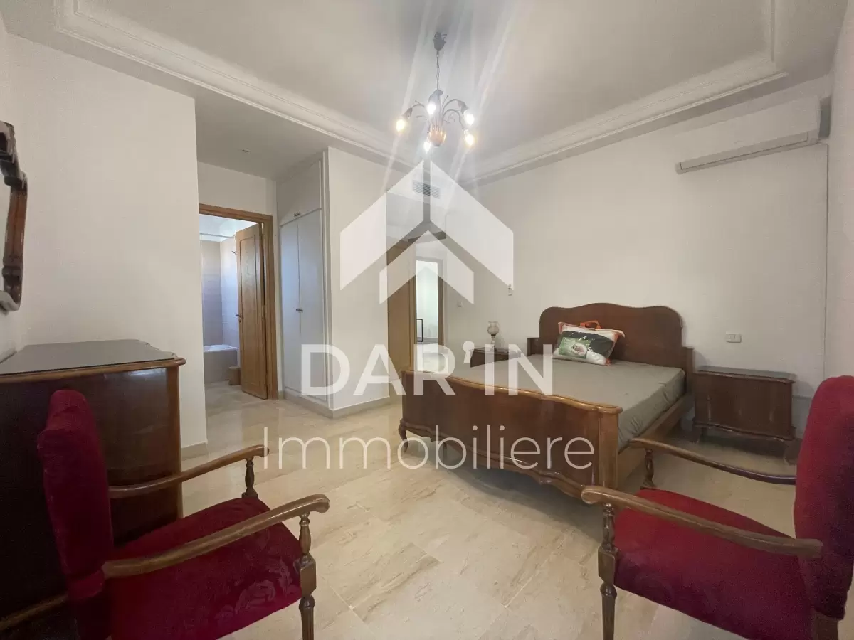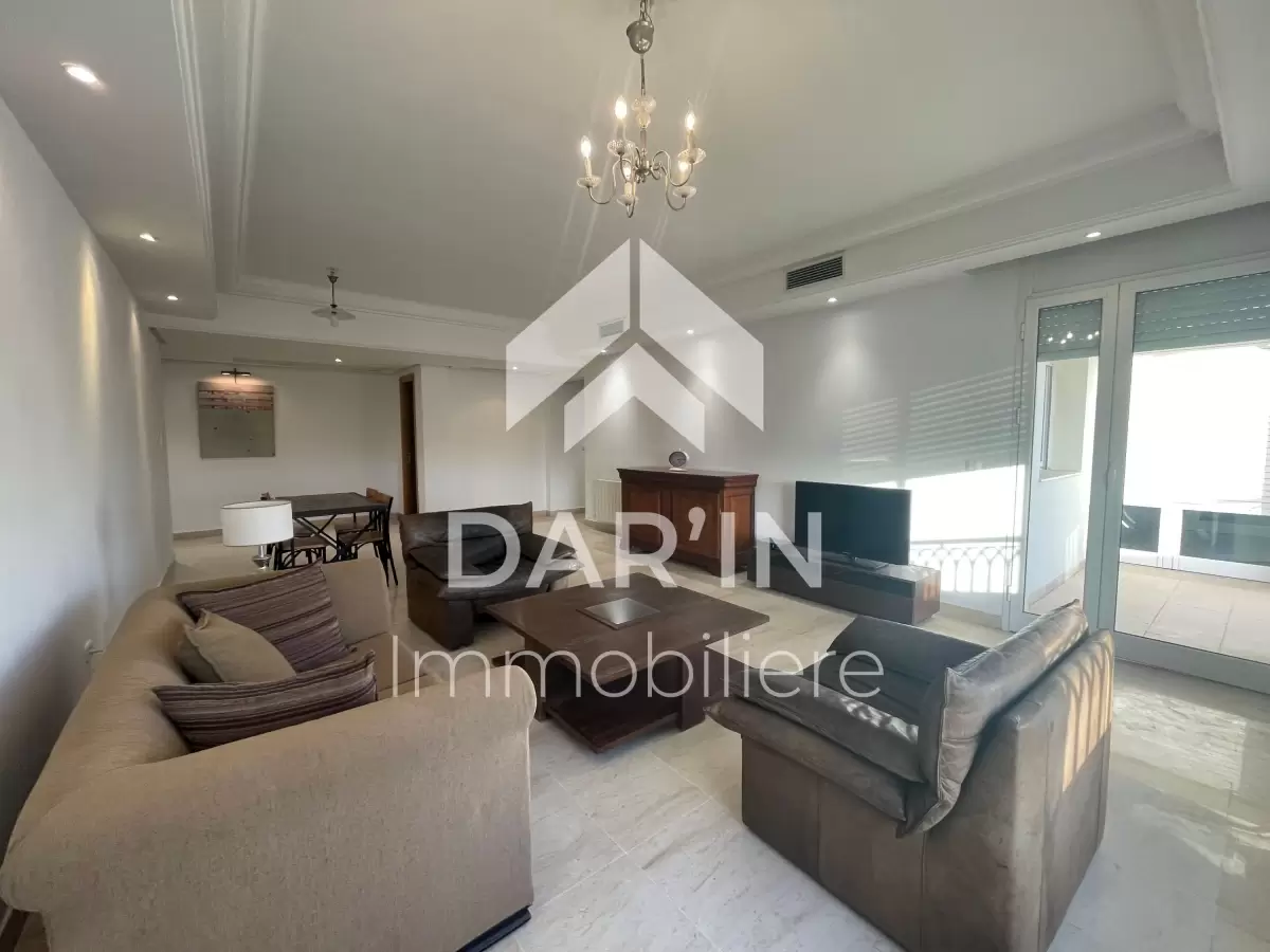 Dar'In immobiliére vous propose à la location un appartement S+3 richement meublé dans une résidence gardé avec ascenseur situé coté carrefour la Marsa composé comme suit : salon spacieux avec balcon ,salle à manger ,suite parentale avec sa propre dressing et salle de bain ,deux chambres à coucher dont une avec balcon, salle de bain avec baignoire, salle d'eau avec douche ,cuisine bien équipé avec séchoir , Chauffage central et climatisation dans toutes les chambres Place parking sous-sol