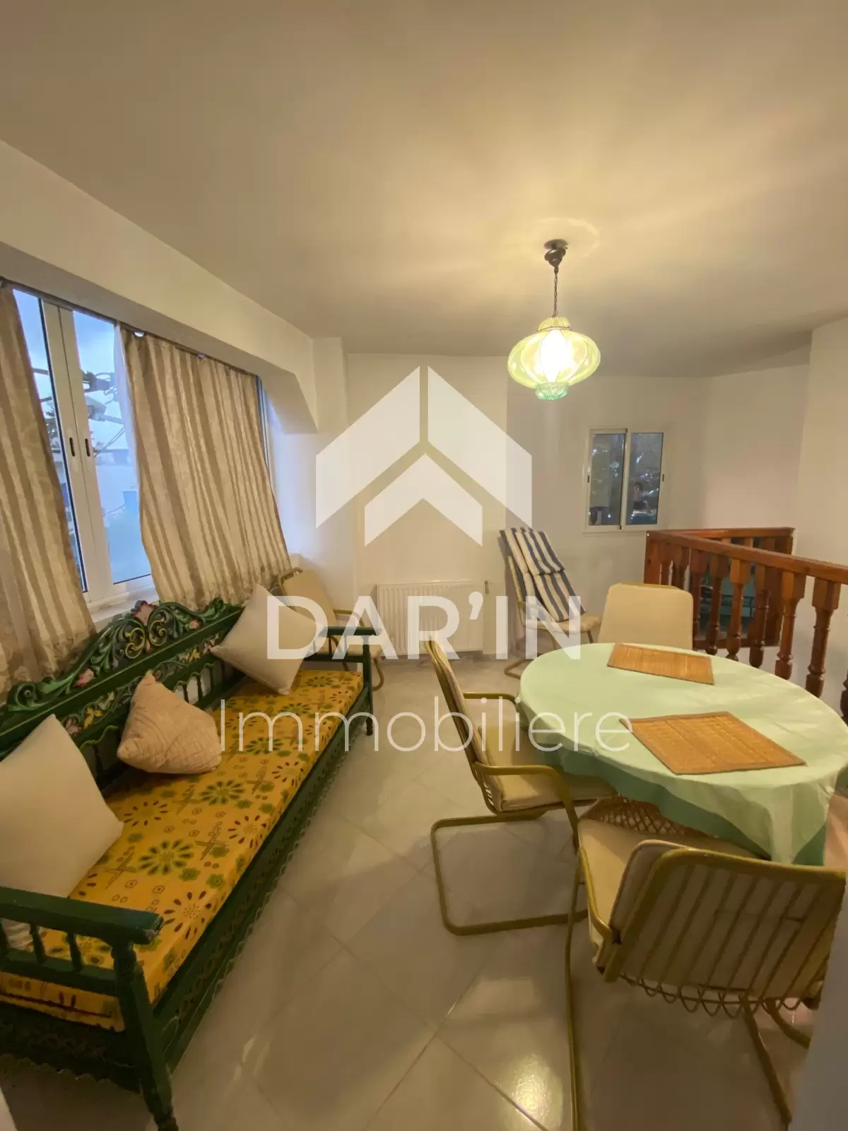 Un étage de villa S+2 meublé avec piscine à la Marsa. Deux salons spacieux. Une cuisine équipée et aménagée par des éléments de rangements. Elle est complétée par un coin repas. Deux chambres à coucher avec placard. Elles partagent une salle de bain commune. Un terrasse spacieux avec une piscine. Chauffage central et climatisation sont fonctionnels.