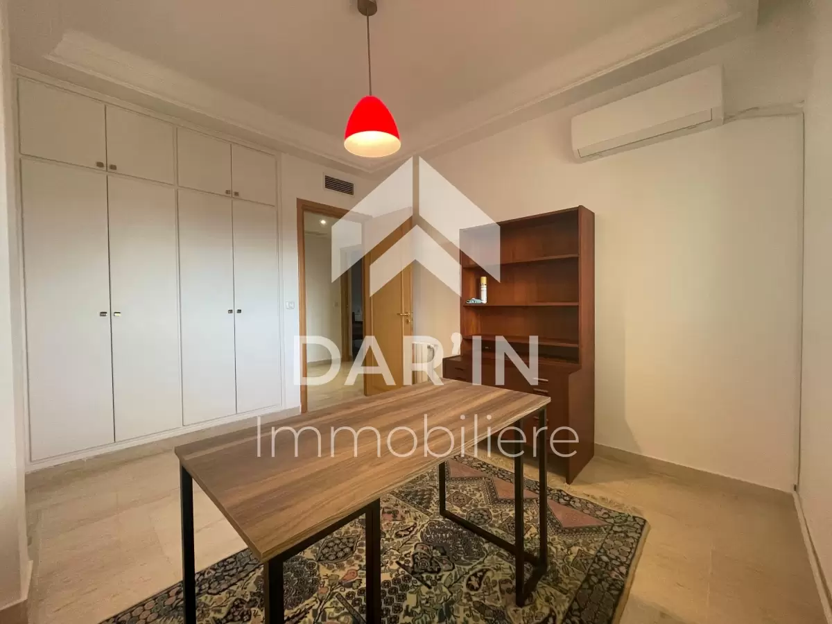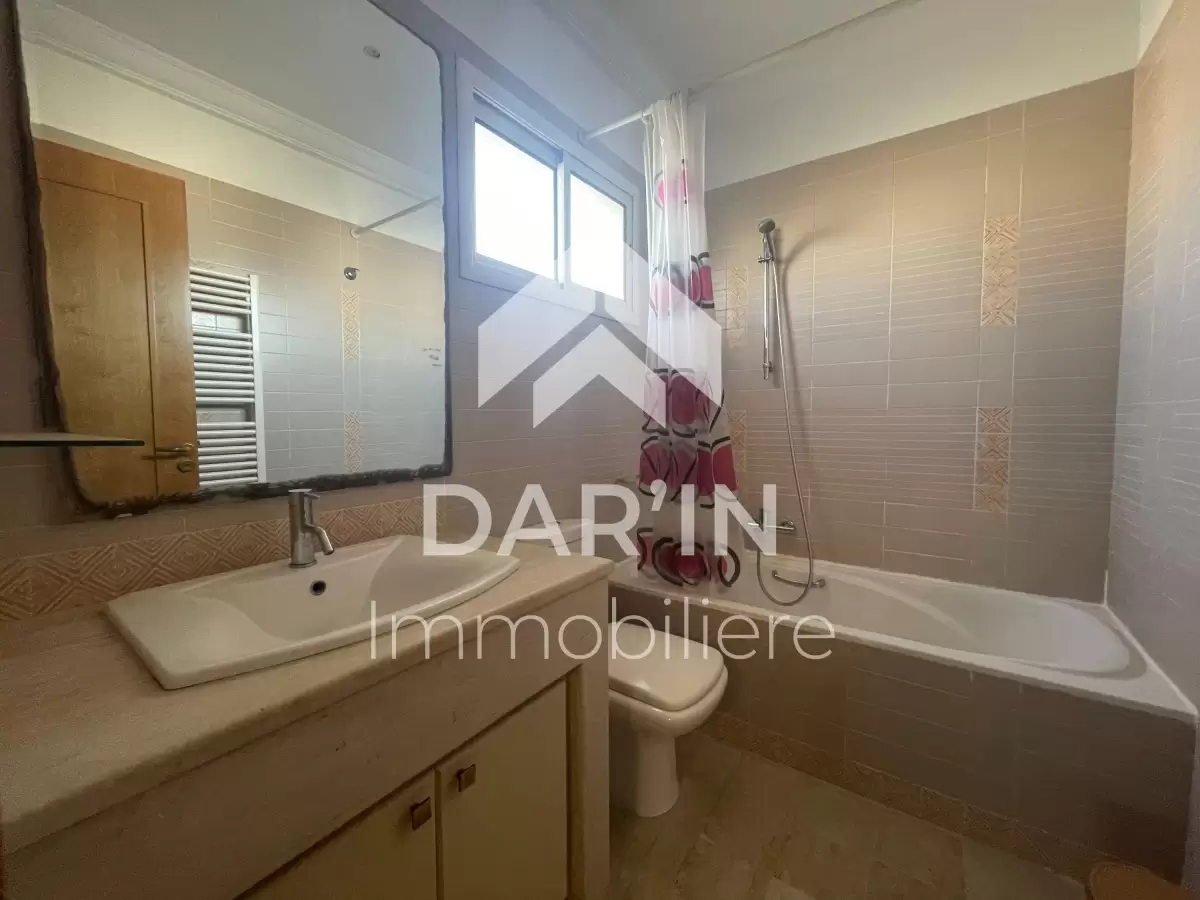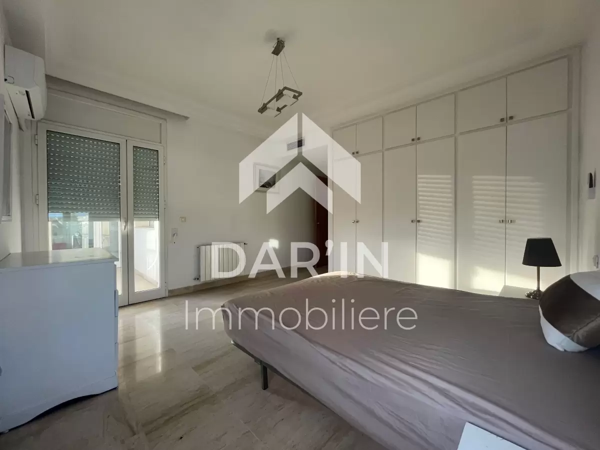 Dar'In immobiliére vous propose à la location un appartement S+3 richement meublé dans une résidence gardé avec ascenseur situé coté carrefour la Marsa composé comme suit : salon spacieux avec balcon ,salle à manger ,suite parentale avec sa propre dressing et salle de bain ,deux chambres à coucher dont une avec balcon, salle de bain avec baignoire, salle d'eau avec douche ,cuisine bien équipé avec séchoir , Chauffage central et climatisation dans toutes les chambres Place parking sous-sol